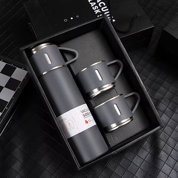تراوا ماگ استیل سه کاپ طرح فلاسک رنگ مشکی و طوسی نگهداری دما تا ۸ساعت